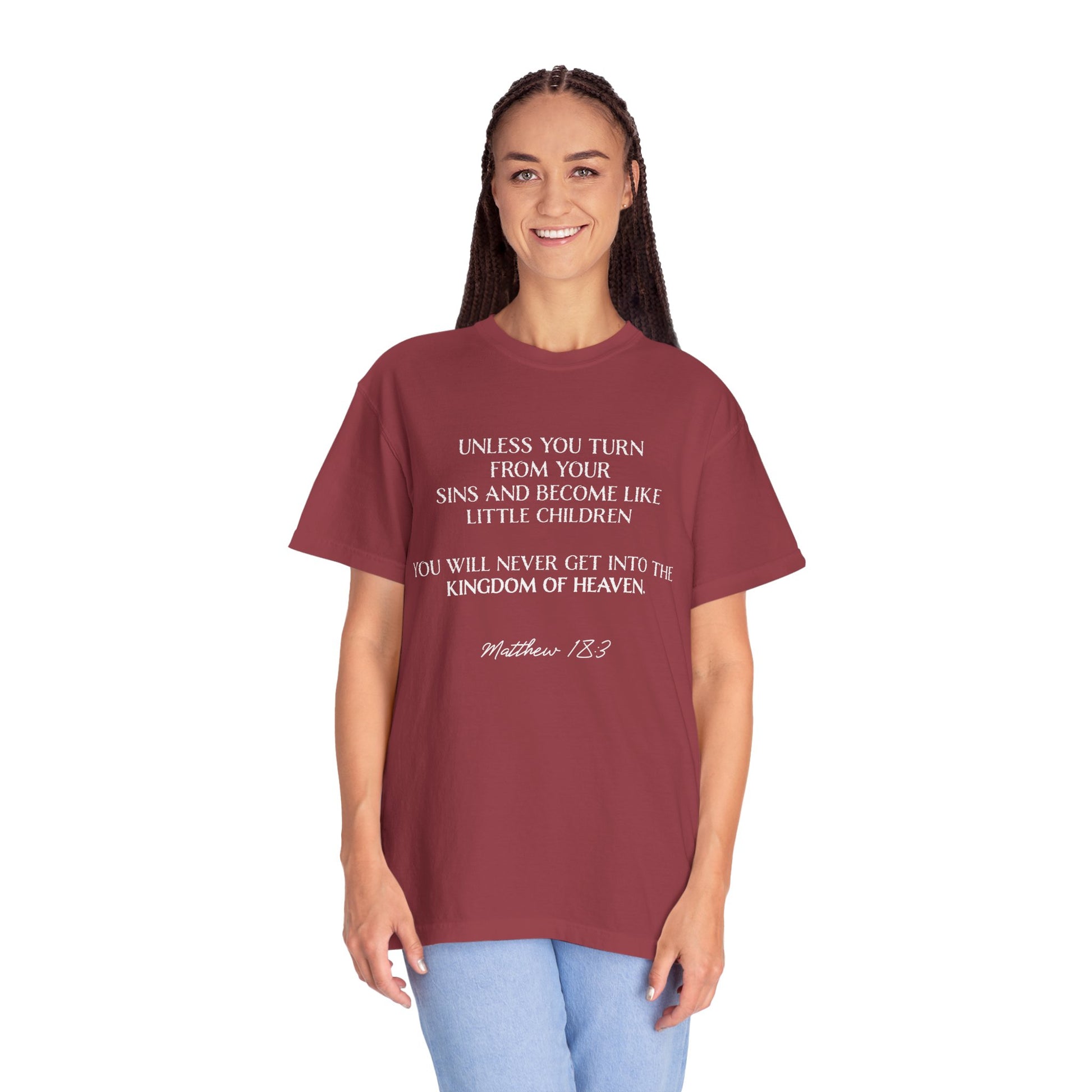 This unisex garment-dyed t-shirt features a powerful quote from Matthew 18:3, reminding wearers to turn from their sins and approach life with childlike innocence. The relaxed fit and soft cotton fabric make it a comfortable and meaningful addition to anyone's wardrobe. Perfect for those seeking spiritual inspiration and reflection, this t-shirt is ideal for religious holidays, church events, and everyday wear.
