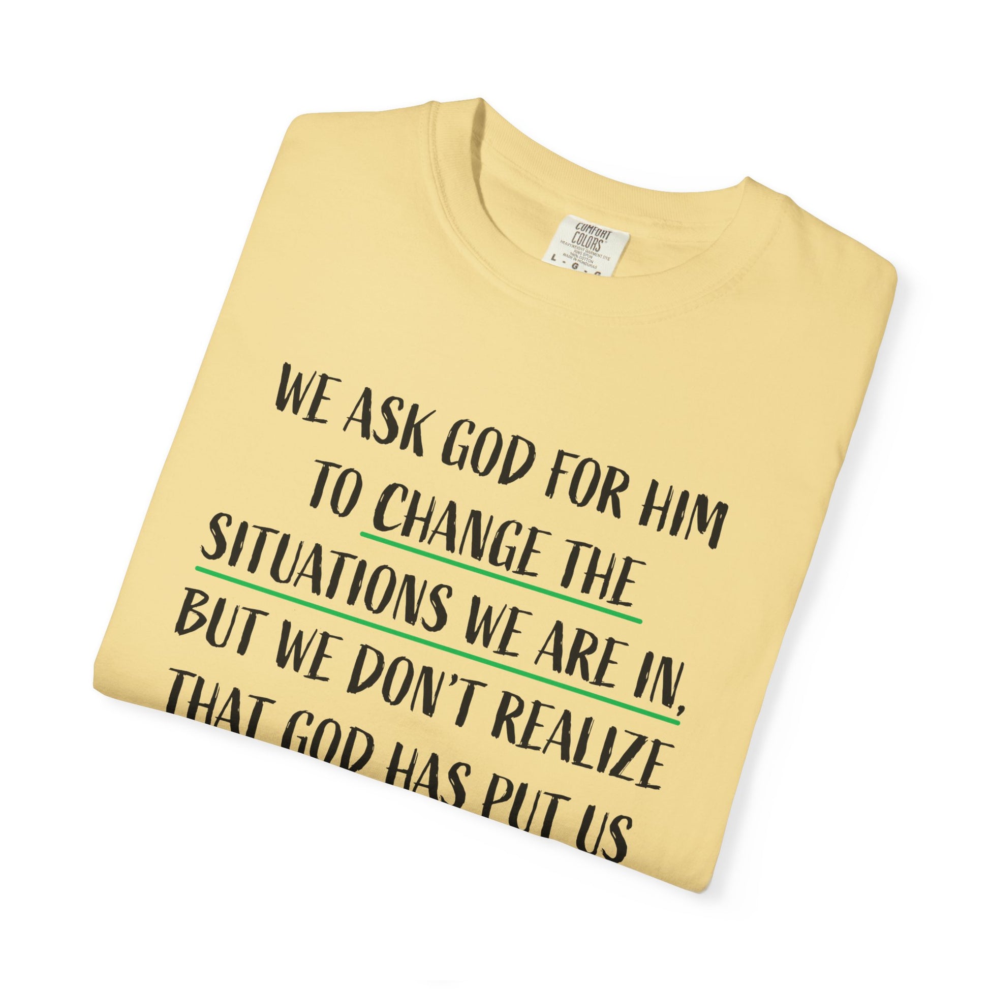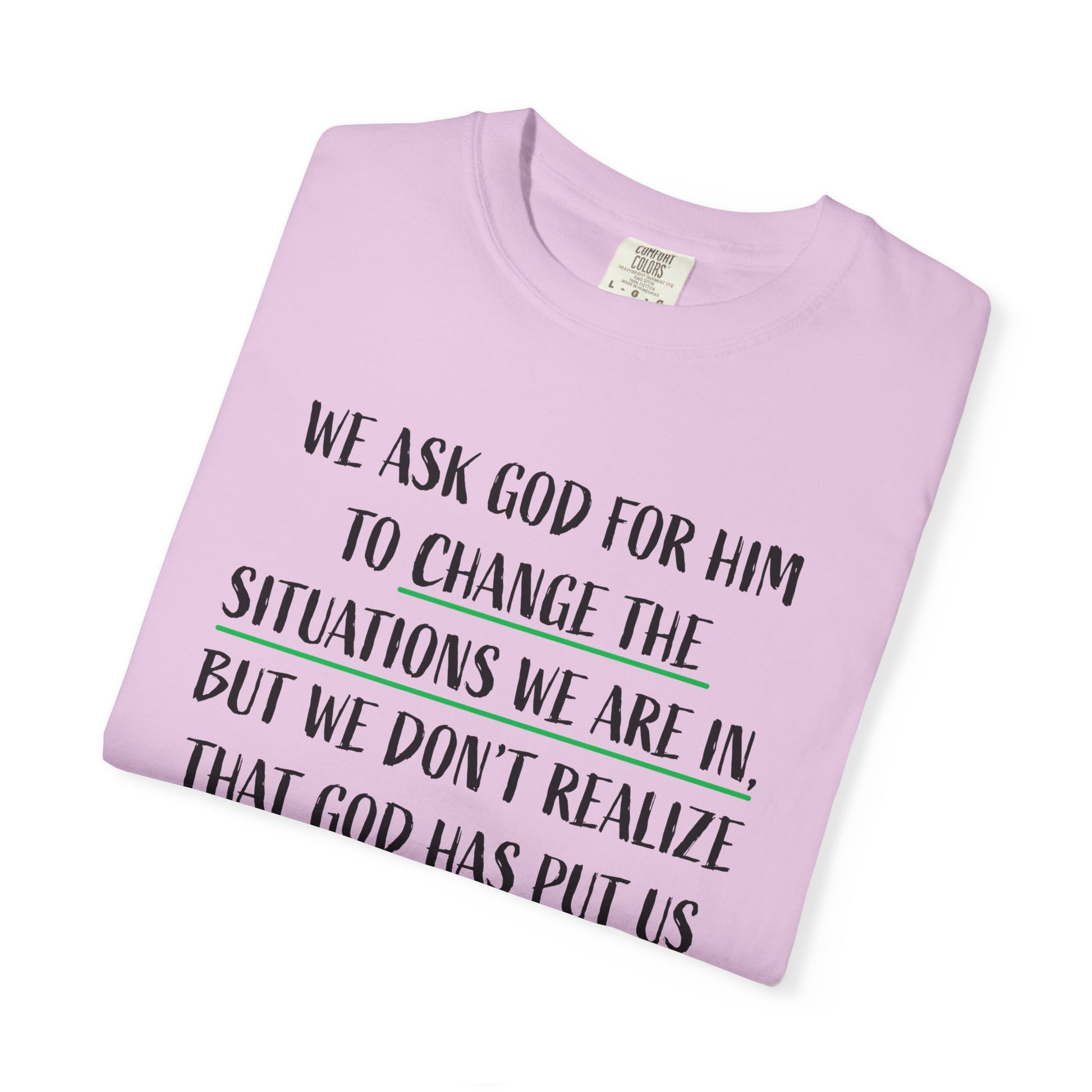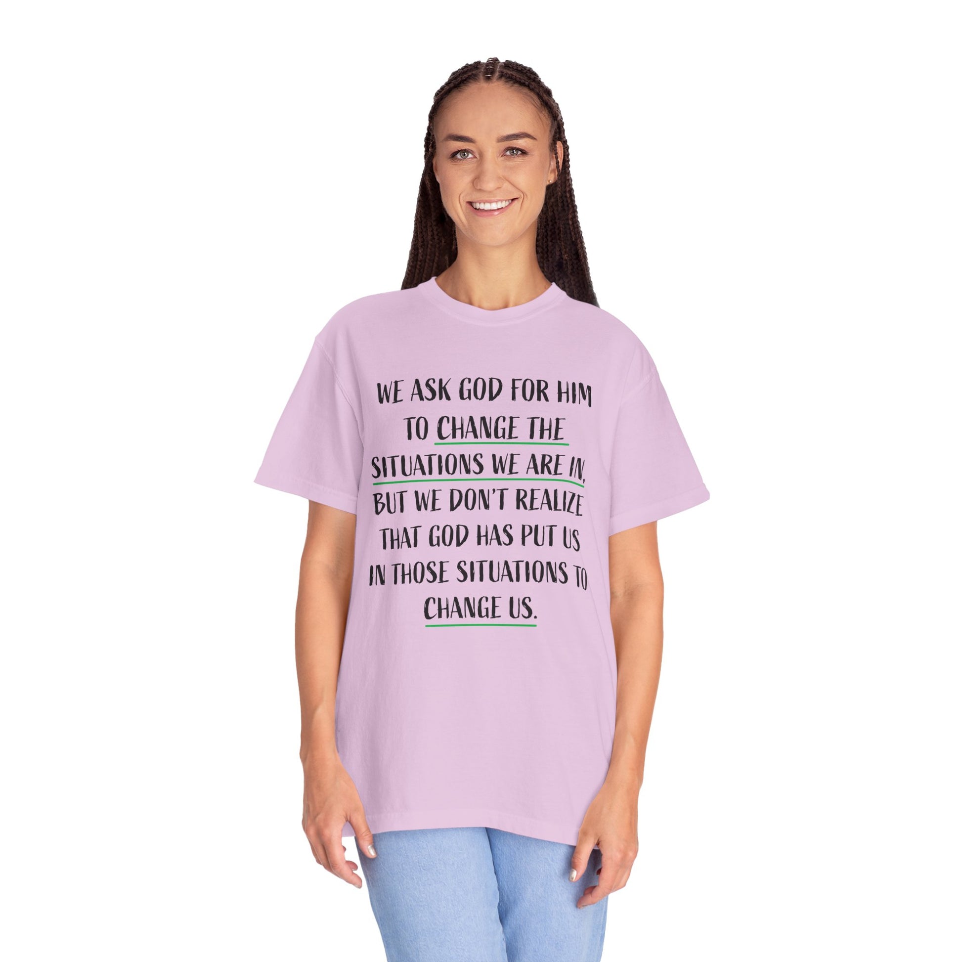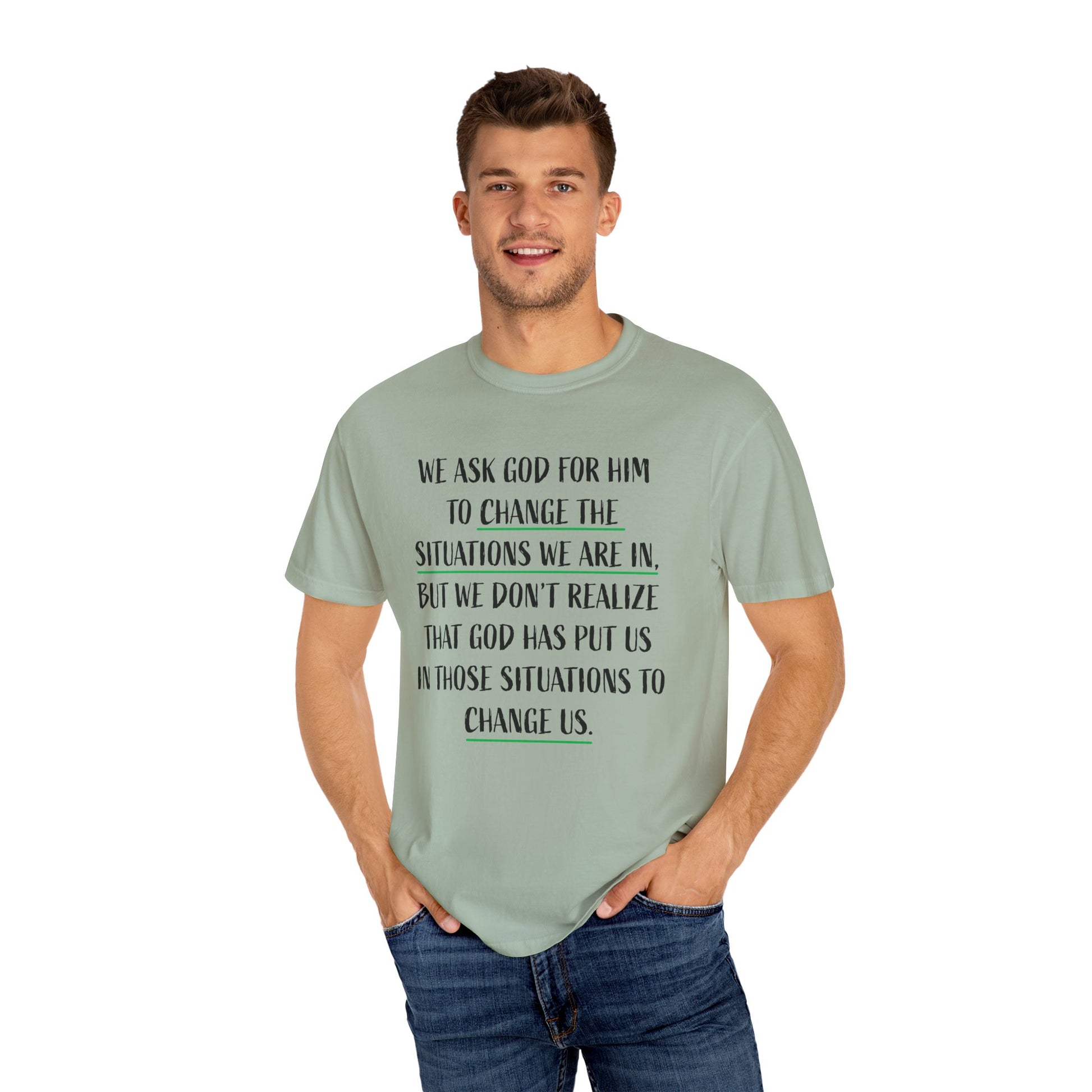 This unisex garment-dyed T-shirt features a powerful message reminding us to embrace the situations we are in because they are meant to change us. With its comfortable fit and versatile design, this T-shirt is perfect for those seeking spiritual inspiration and reflection. Ideal for religious holidays, retreats, and everyday wear.