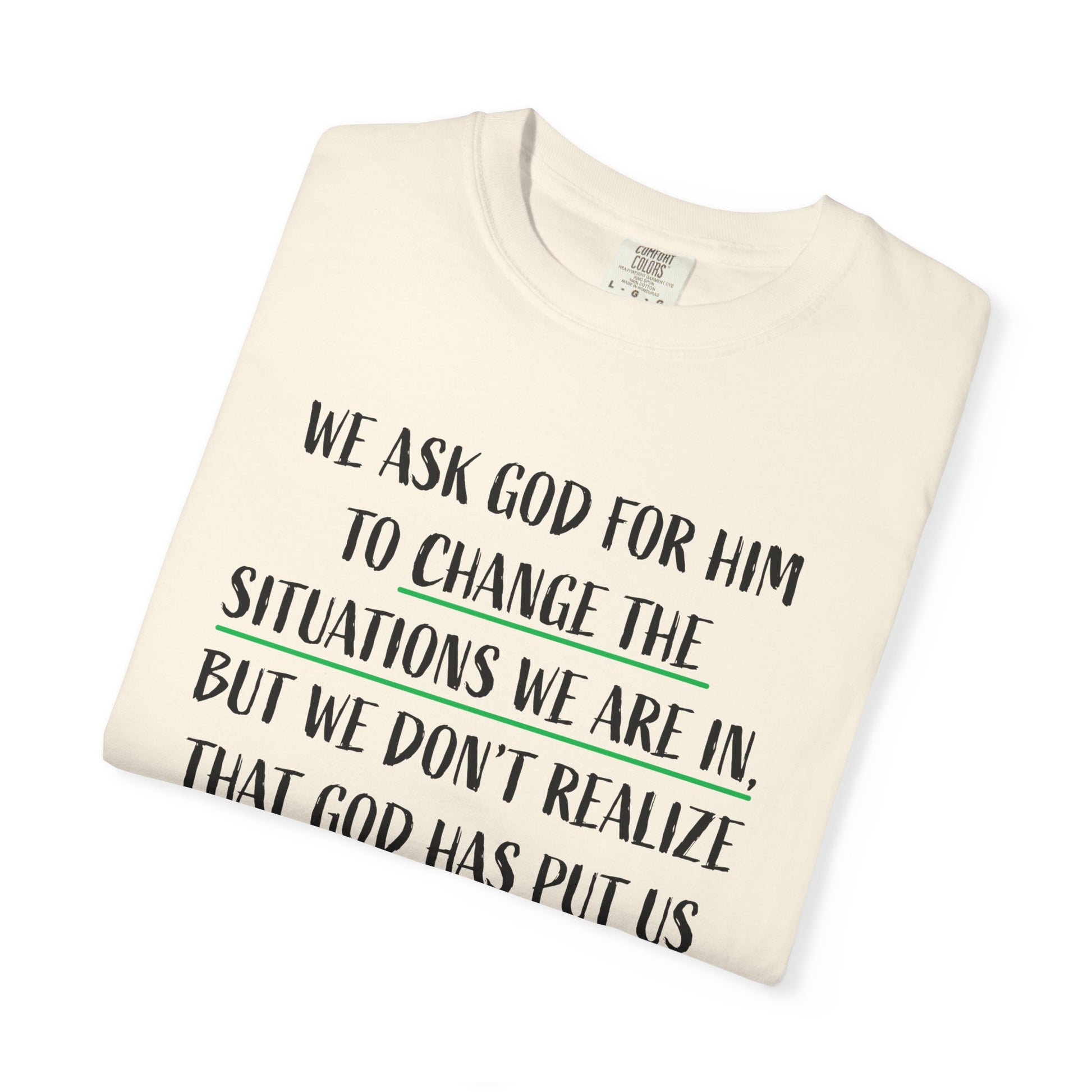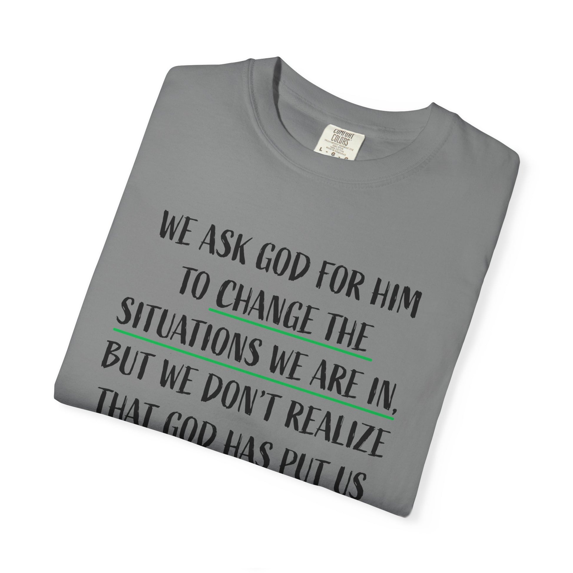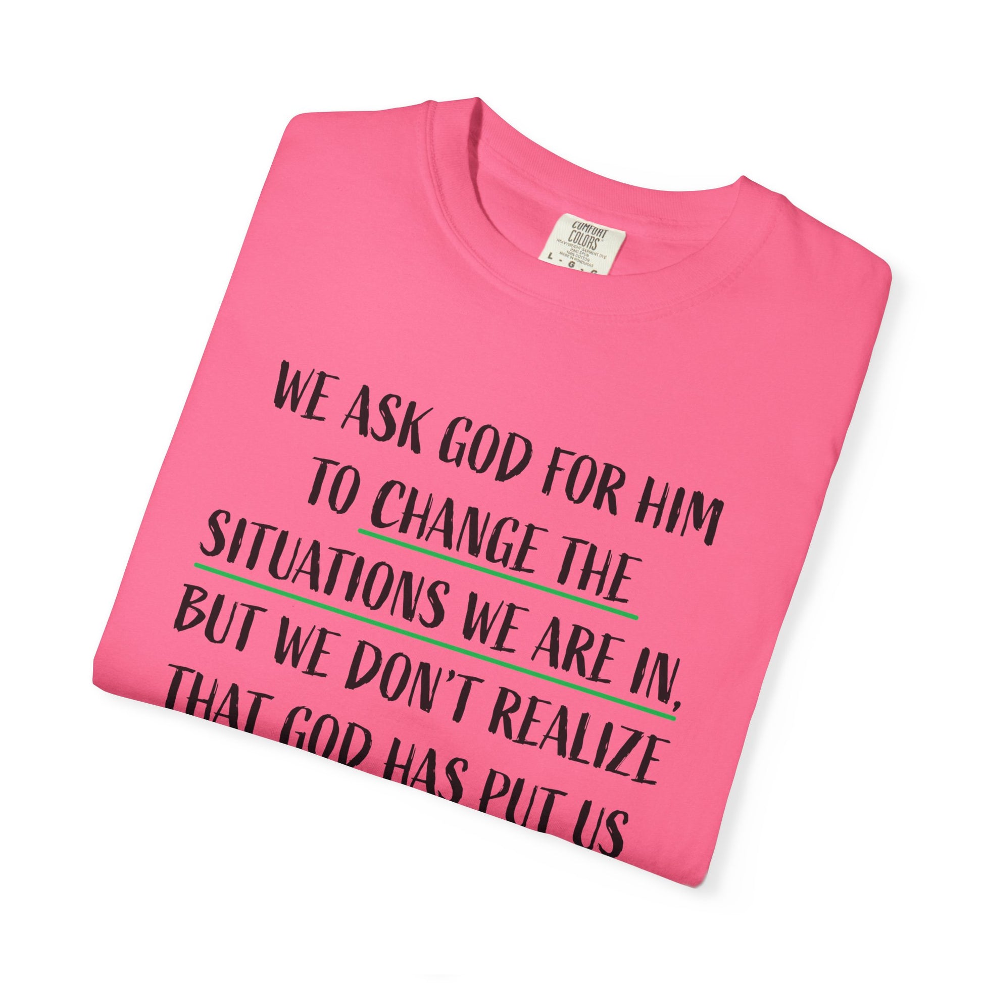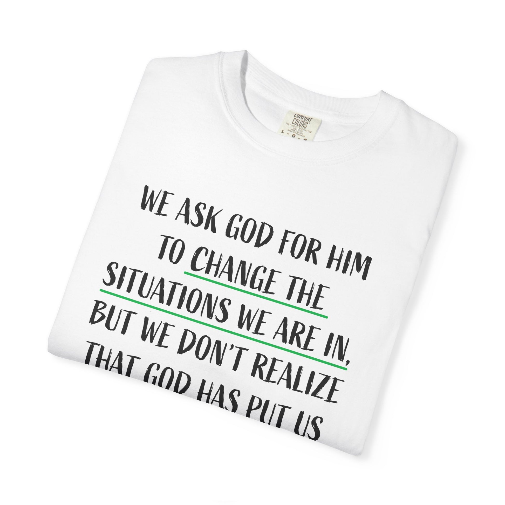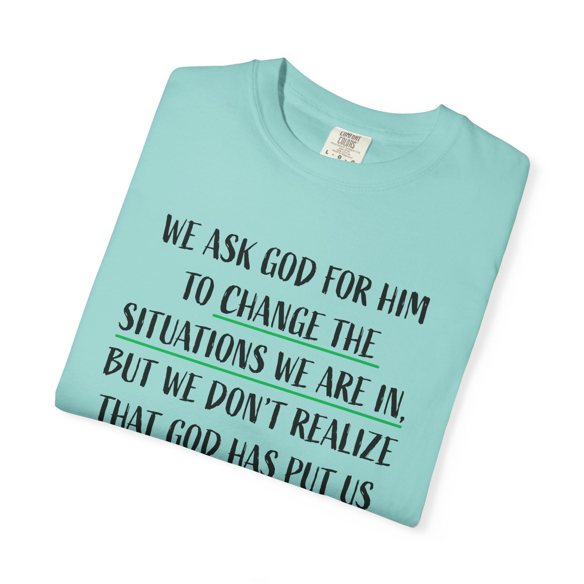 This unisex garment-dyed T-shirt features a powerful message reminding us to embrace the situations we are in because they are meant to change us. With its comfortable fit and versatile design, this T-shirt is perfect for those seeking spiritual inspiration and reflection. Ideal for religious holidays, retreats, and everyday wear.