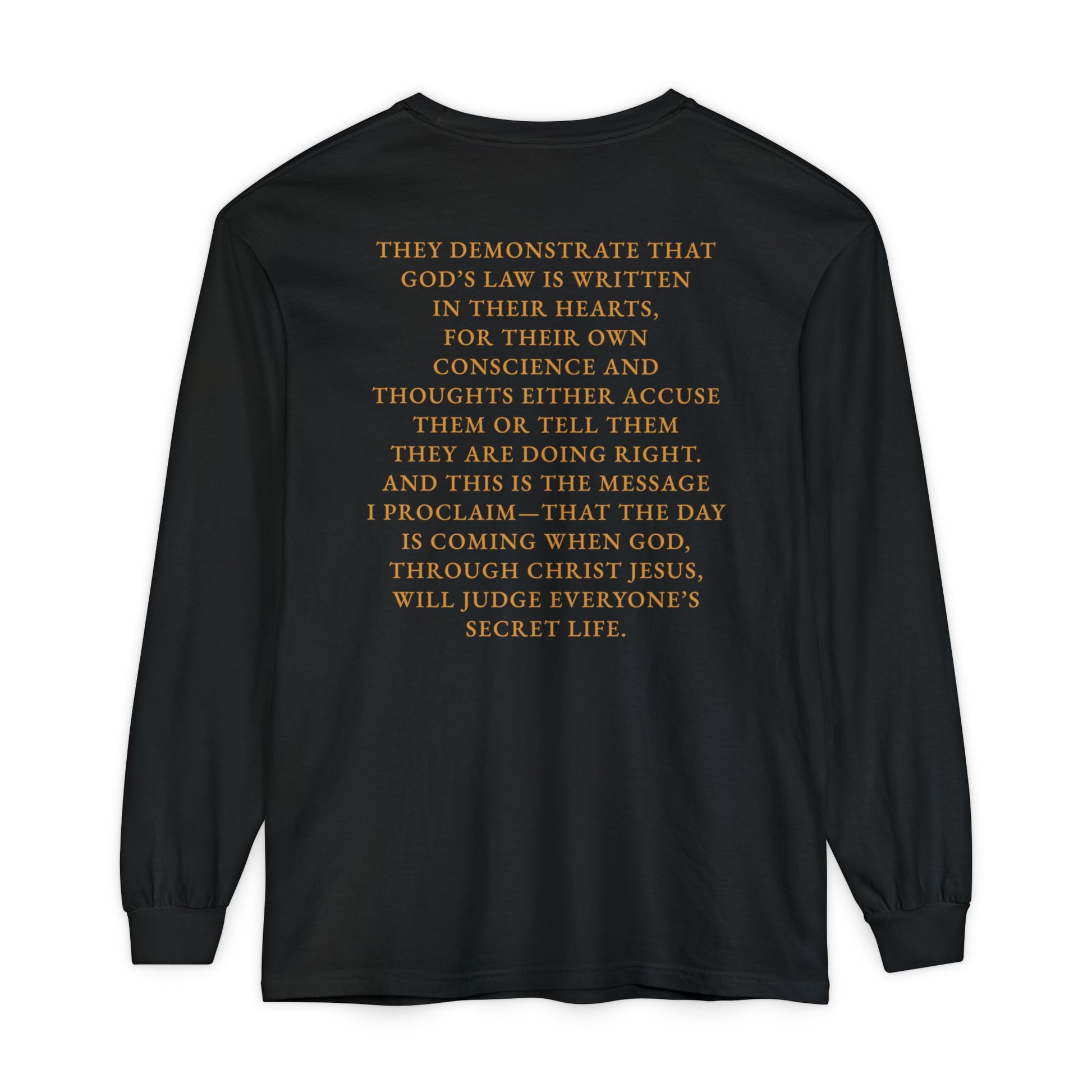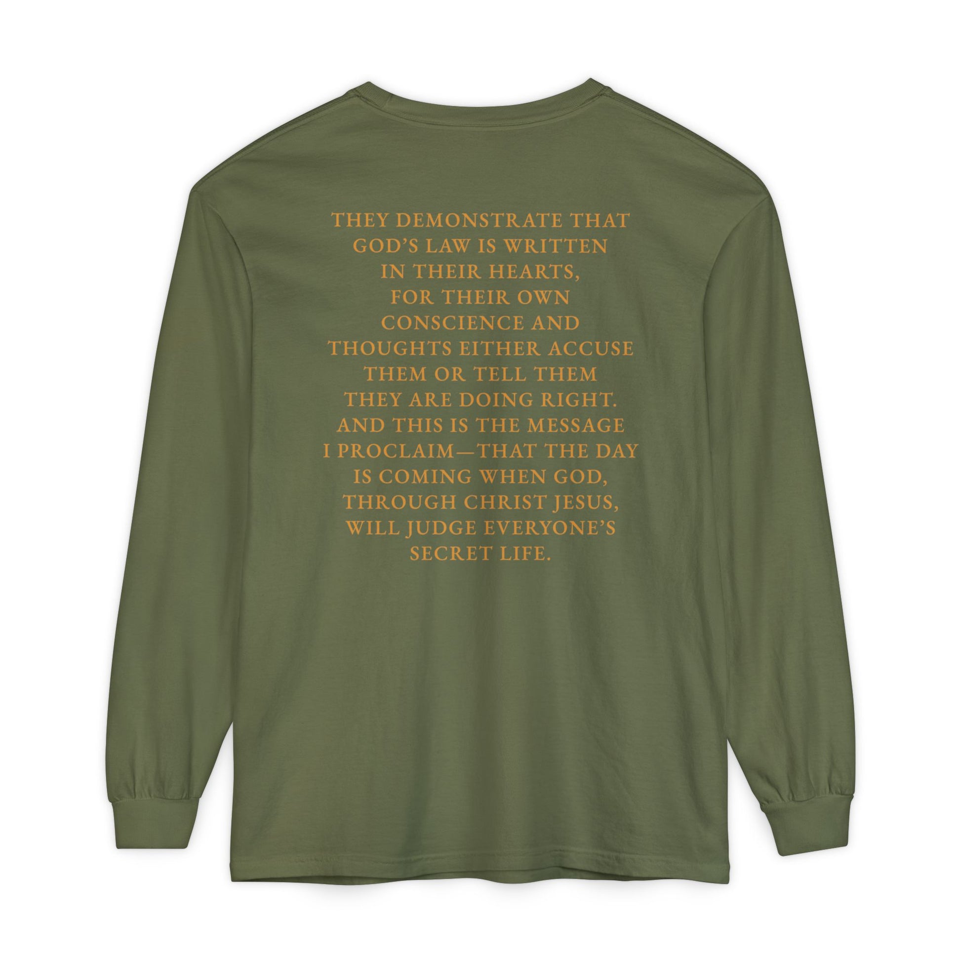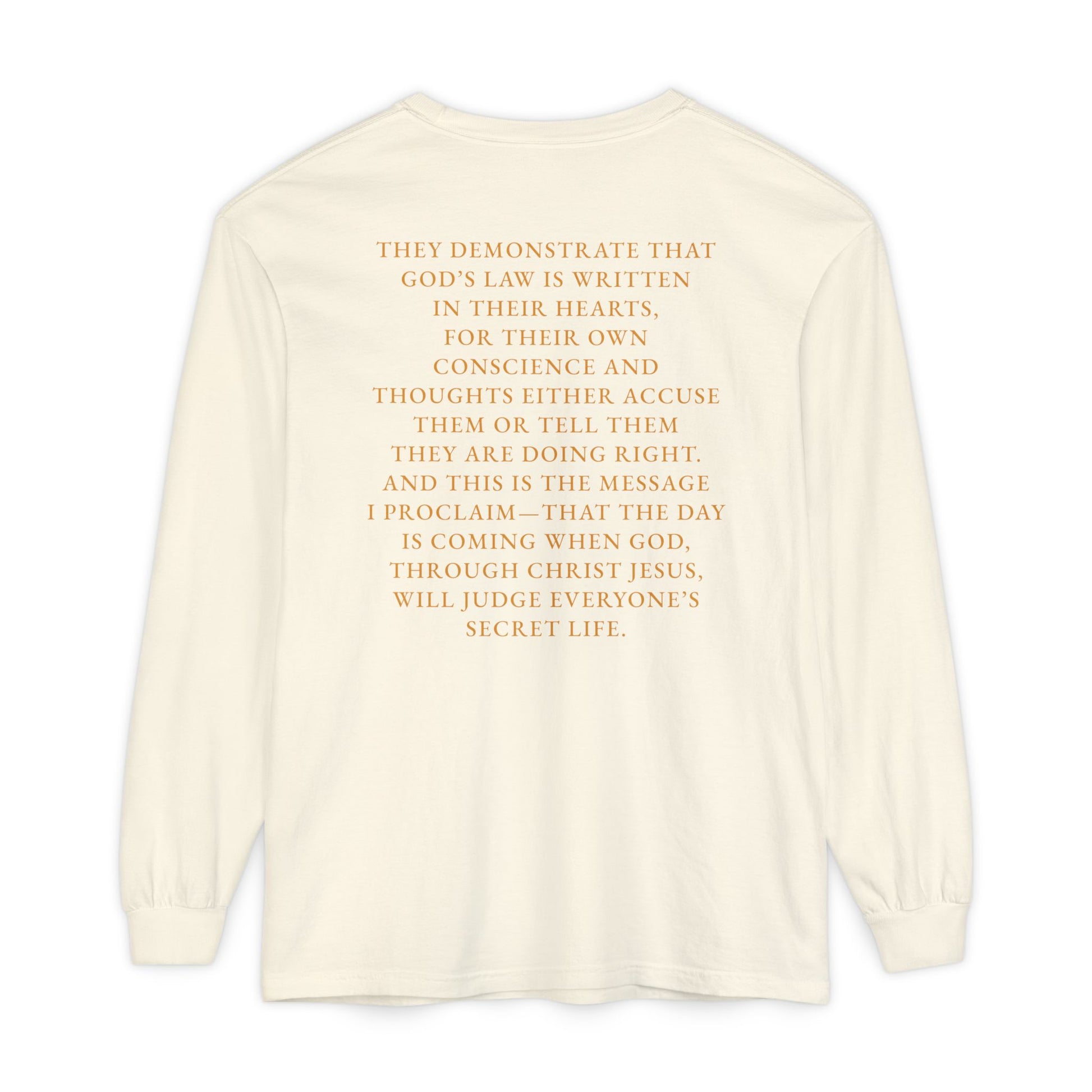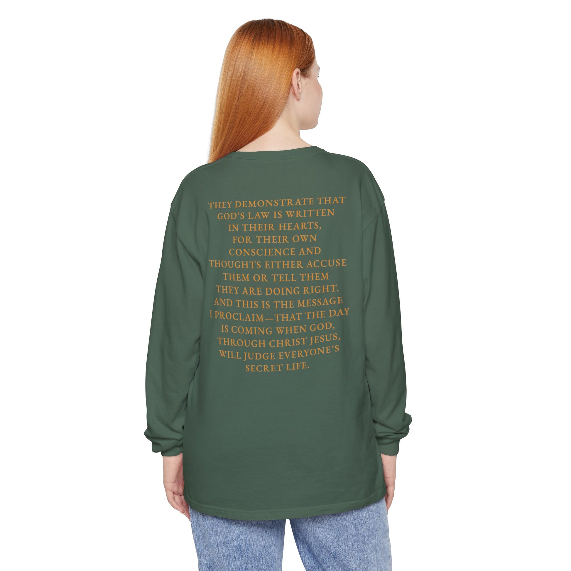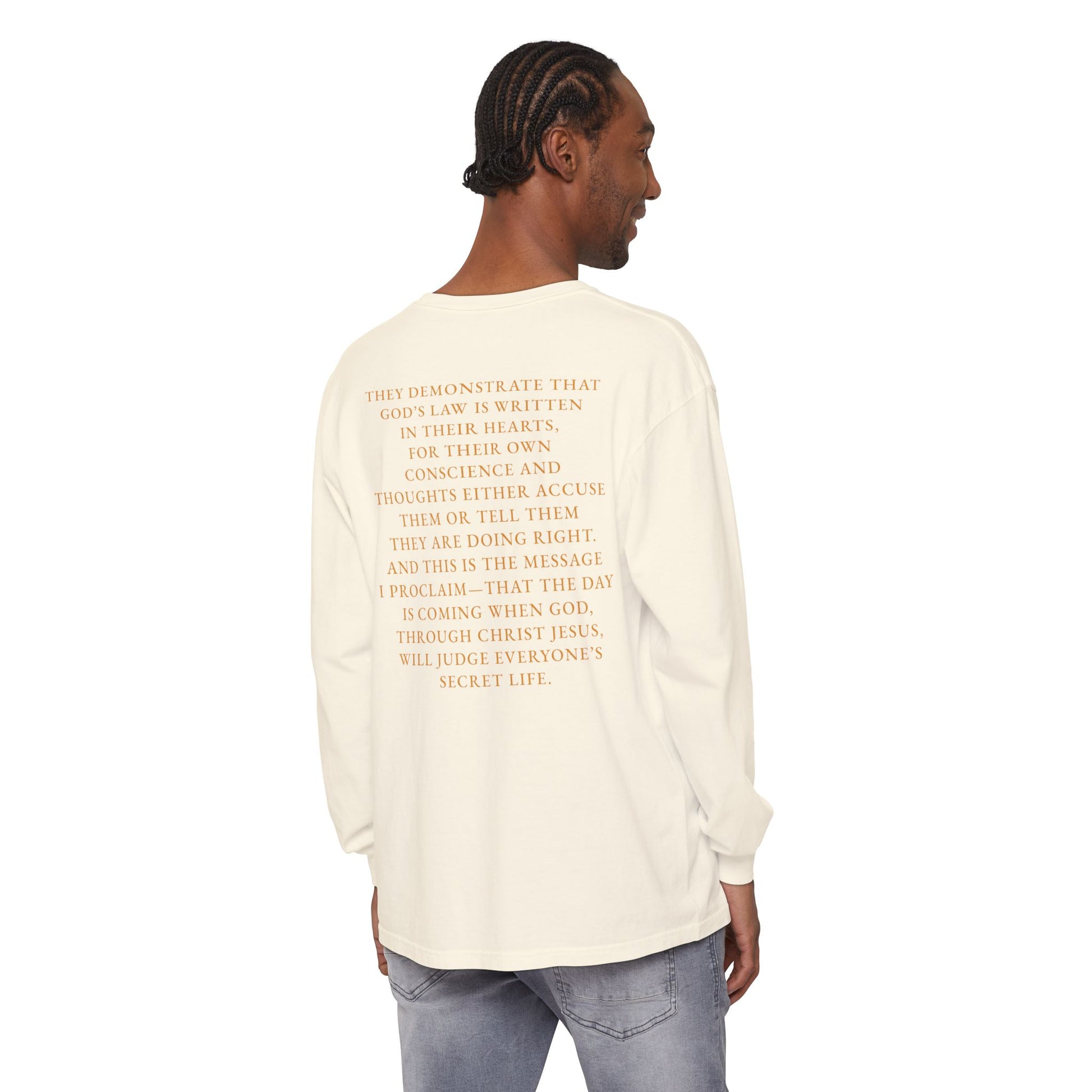 This unisex long sleeve t-shirt exudes a unique blend of comfort and style. Featuring a thought-provoking design that resonates with those who appreciate spirituality and introspection, it invites deep reflection. The soft garment-dyed fabric and classic fit make it perfect for leisurely days, casual outings, or cozy evenings at home. It’s a versatile piece for individuals who value meaningful expressions in their wardrobe. Ideal for gifting during holidays, celebrations, or simply to uplift a friend, this t-shirt speaks to the faith-driven and the introspective alike, making it a perfect addition to any casual collection.