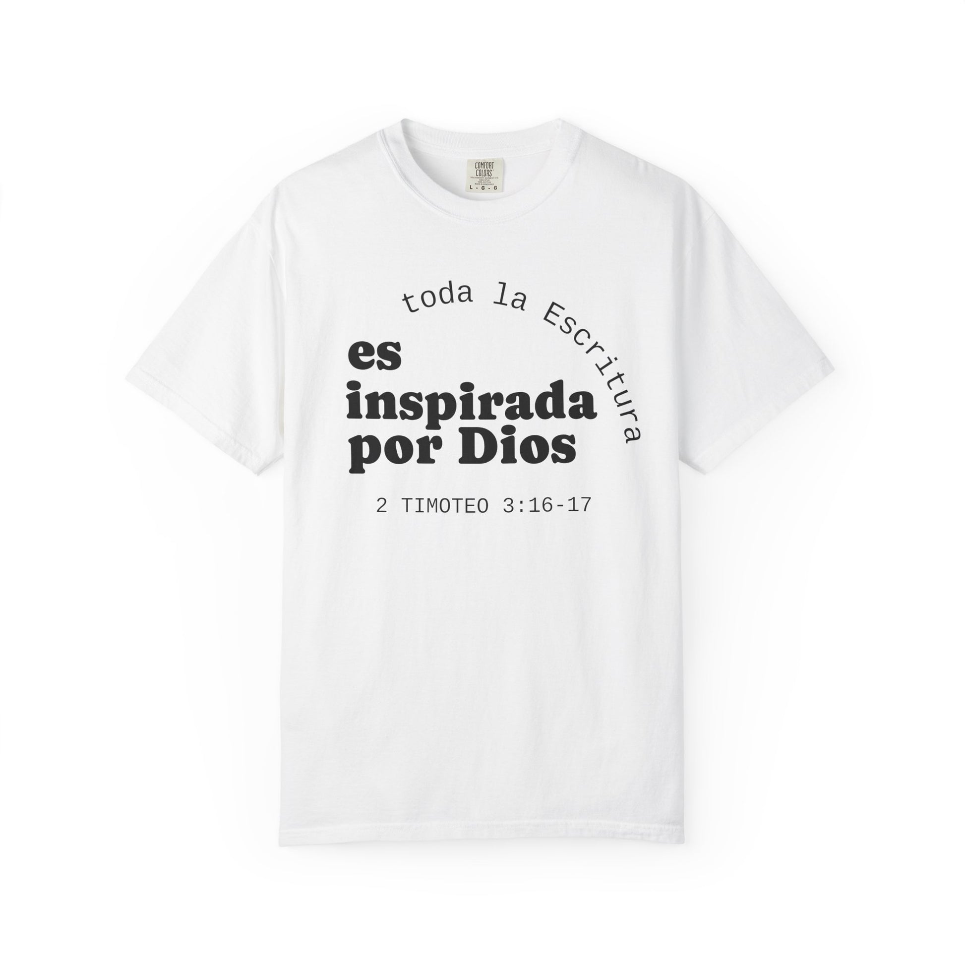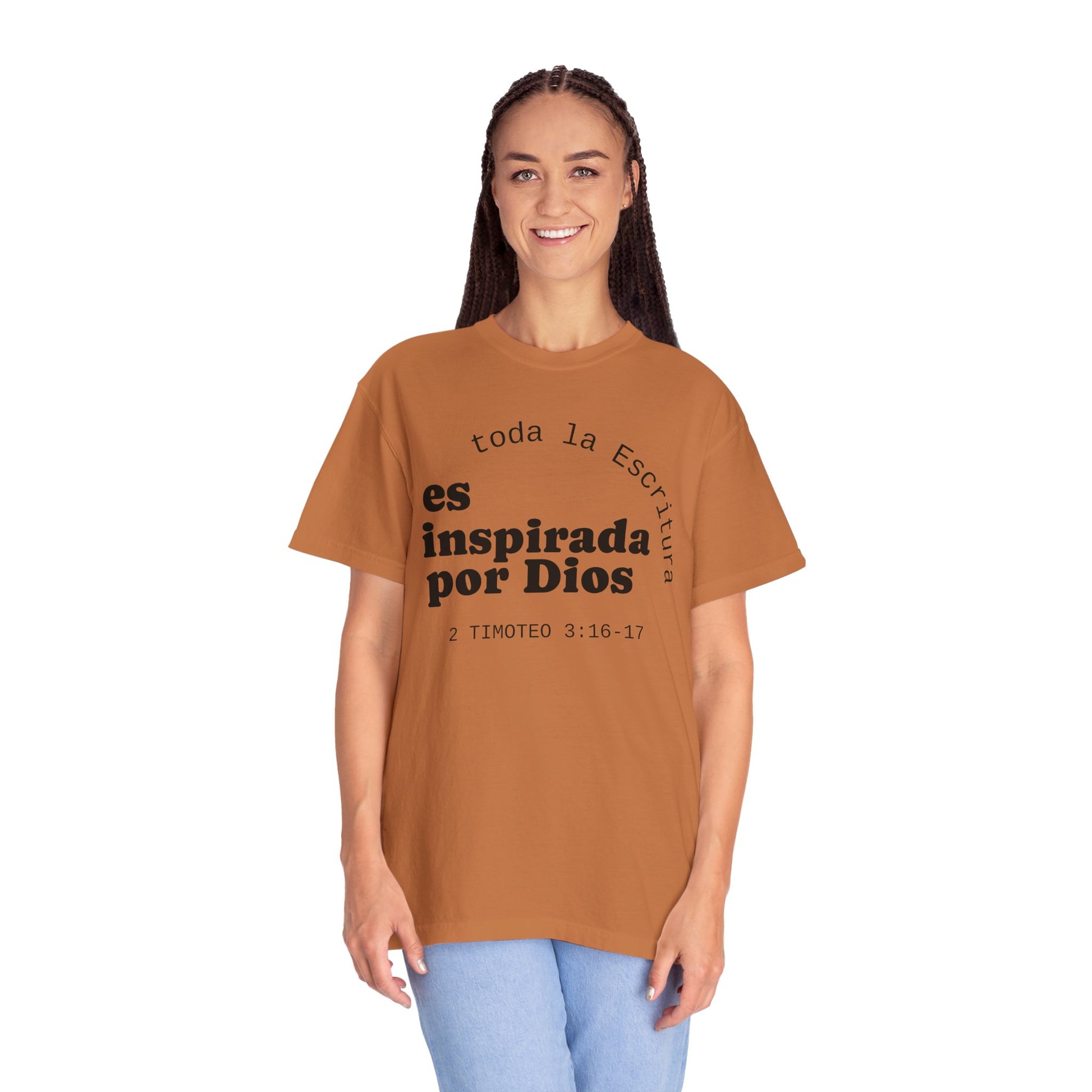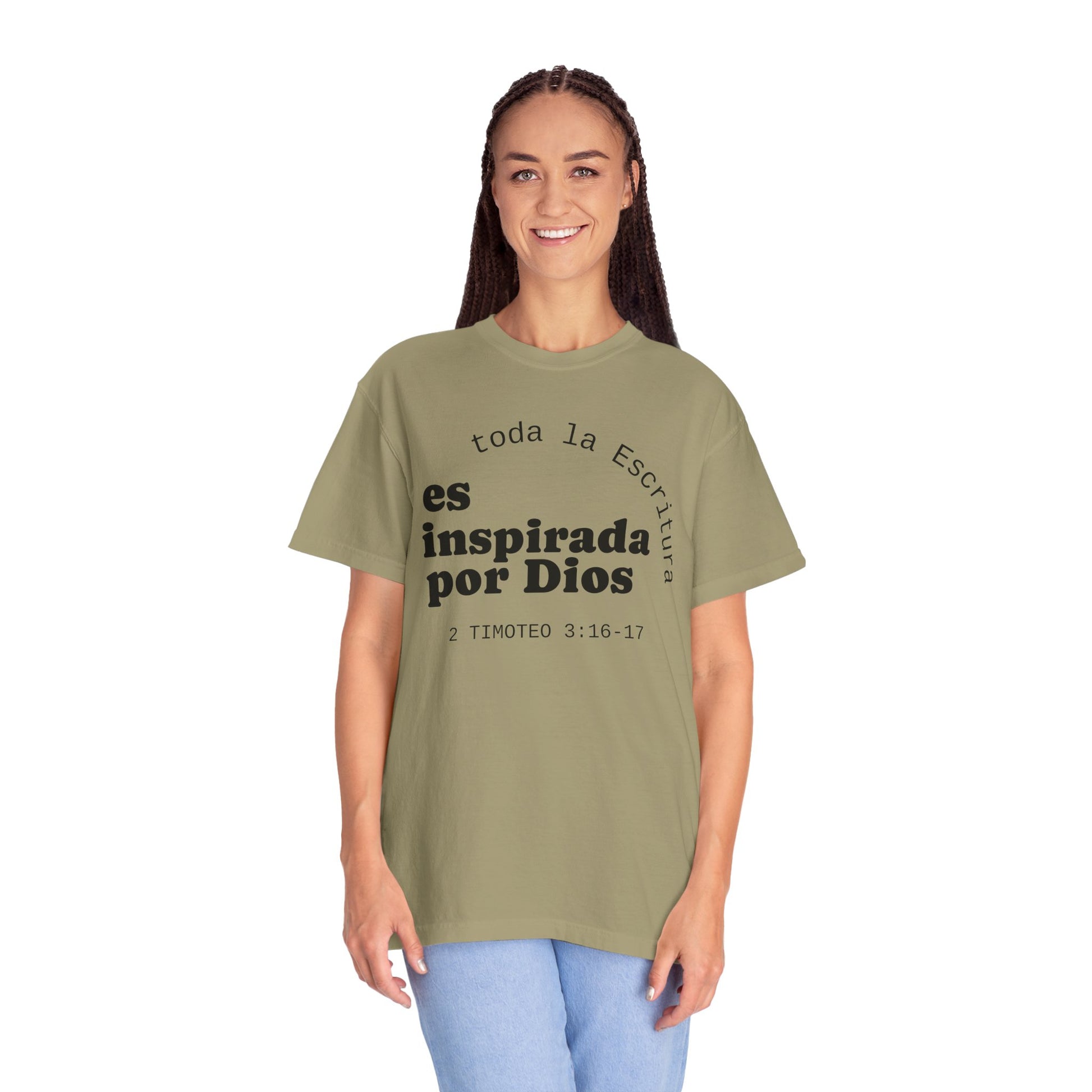 Soft, breathable tee with a quiet, faith-forward message in Spanish: "toda la Escritura es inspirada por Dios" with the citation 2 Timoteo 3:16–17. The garment-dyed cotton has a lived-in hand and a relaxed silhouette that settles easily into daily routines — church mornings, volunteer shifts, coffee runs, or evenings of neighborhood fellowship. The front text is set with a calm, modern layout and the back bears a small centered logo near the neckline, keeping the look minimal and contemplative. This shirt feels unforced and sincere, the kind you reach for when you want your clothing to speak gently about what grounds you without shouting. Made from responsibly sourced ring-spun cotton and finished with double-needle seams and a tubular knit for a clean, comfortable fit.