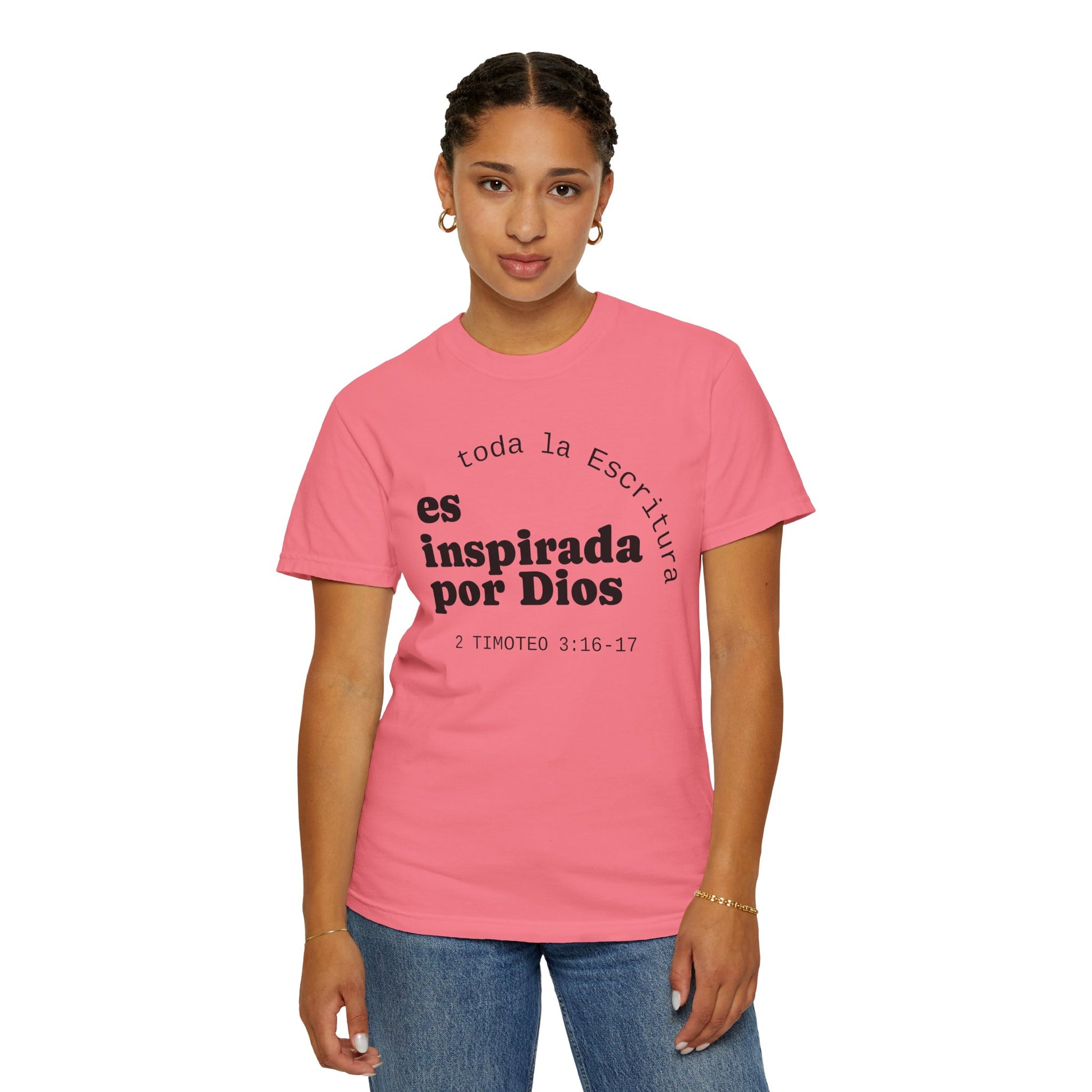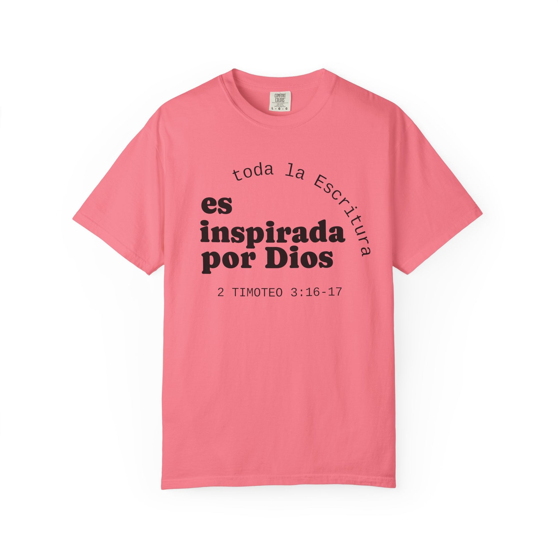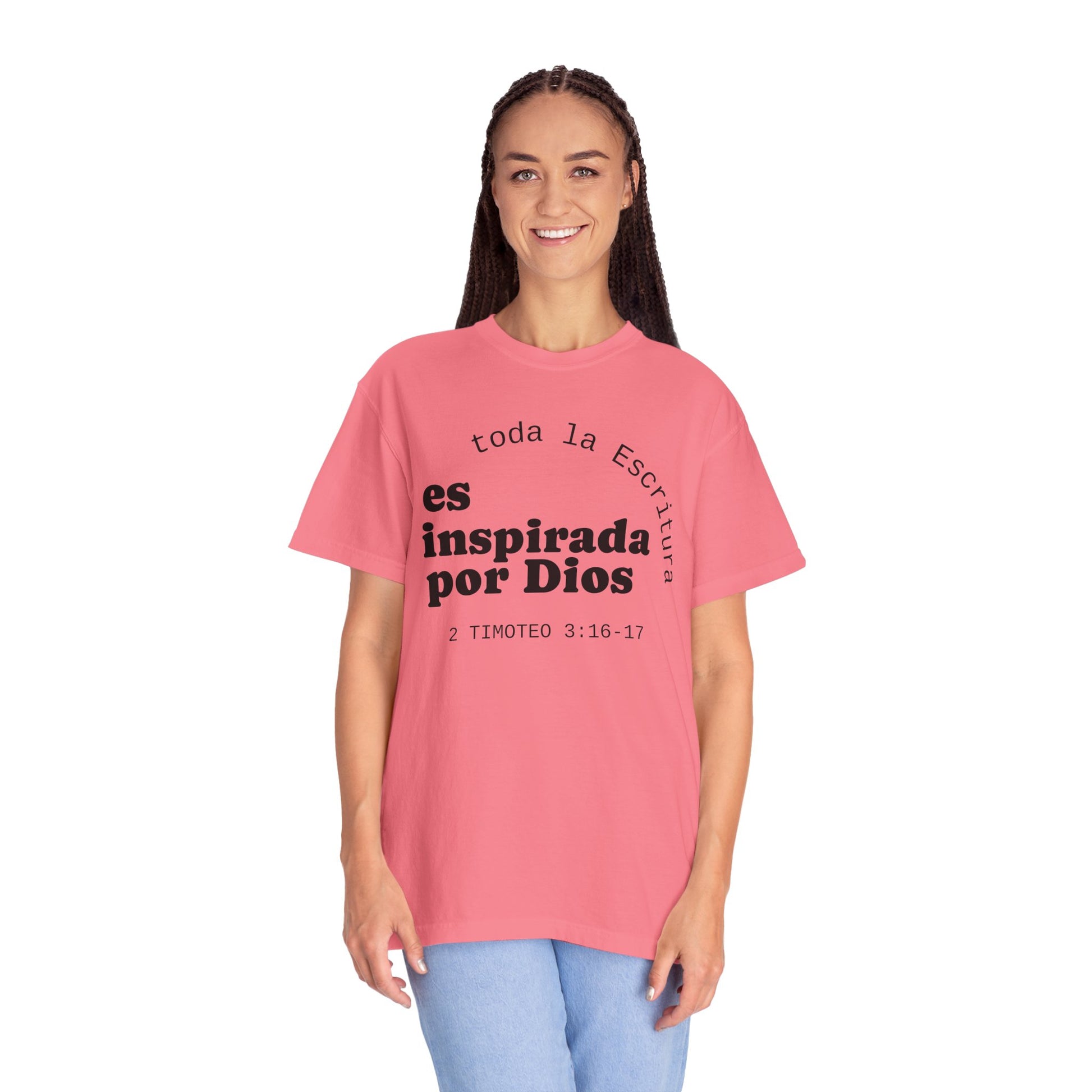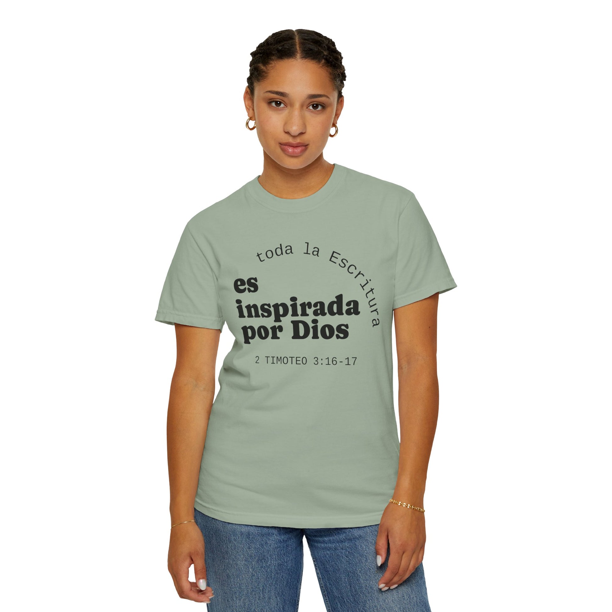 Soft, breathable tee with a quiet, faith-forward message in Spanish: "toda la Escritura es inspirada por Dios" with the citation 2 Timoteo 3:16–17. The garment-dyed cotton has a lived-in hand and a relaxed silhouette that settles easily into daily routines — church mornings, volunteer shifts, coffee runs, or evenings of neighborhood fellowship. The front text is set with a calm, modern layout and the back bears a small centered logo near the neckline, keeping the look minimal and contemplative. This shirt feels unforced and sincere, the kind you reach for when you want your clothing to speak gently about what grounds you without shouting. Made from responsibly sourced ring-spun cotton and finished with double-needle seams and a tubular knit for a clean, comfortable fit.