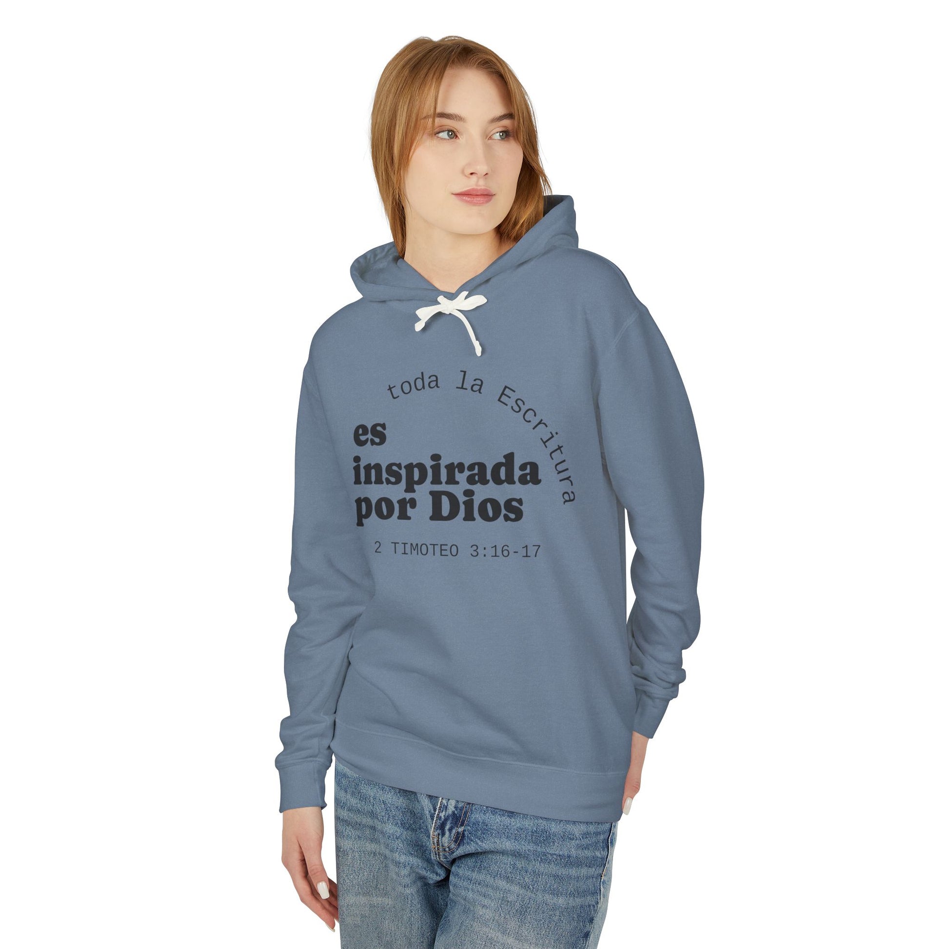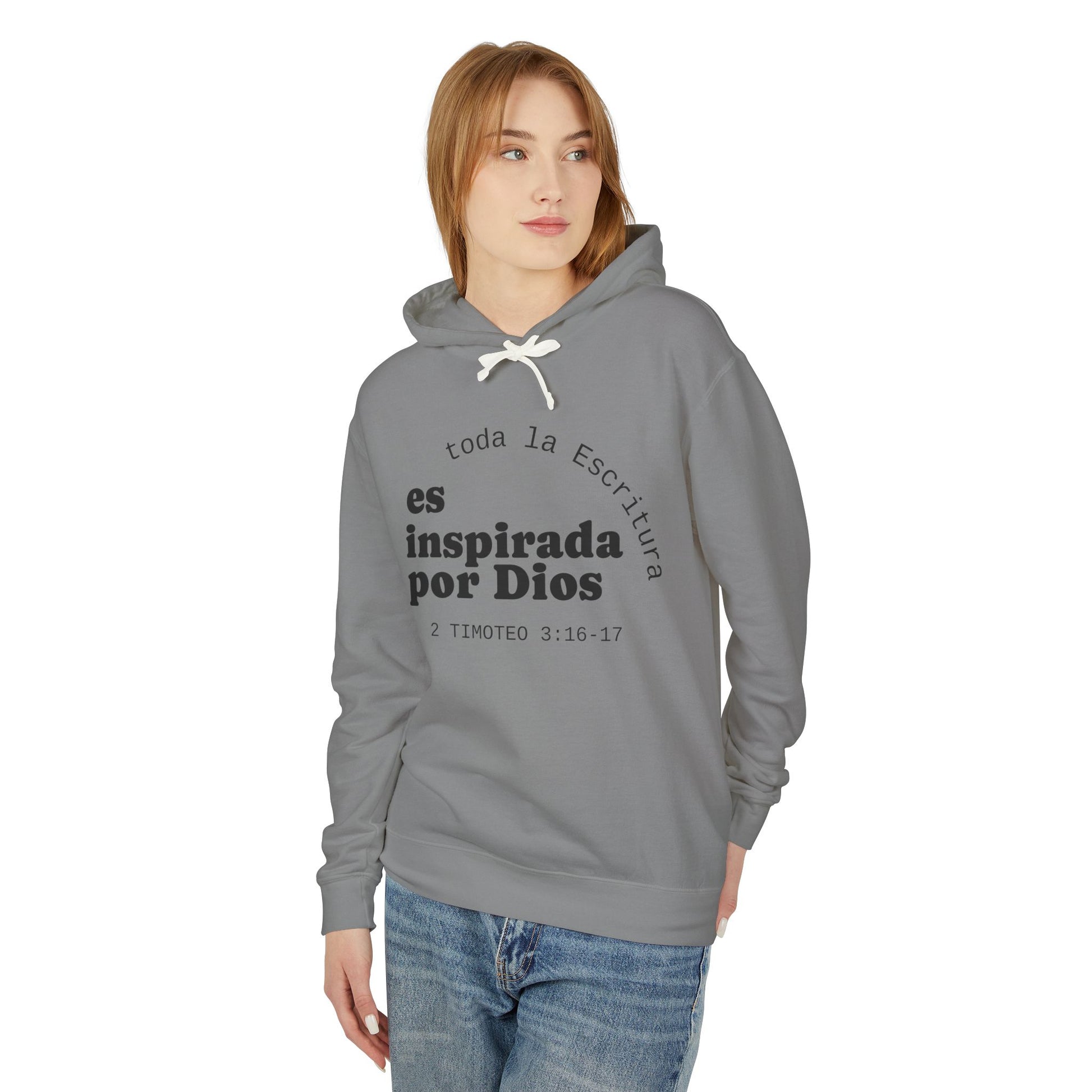 A soft, lightweight hooded sweatshirt printed with a quiet, faith-first message in Spanish. The minimalist black text sits gently on clean white fabric: “toda la Escritura es inspirada por Dios” with the scripture reference below. It reads like a whispered reminder—comfortable against the skin, breathable for layering, and subtle enough to wear to study groups, church gatherings, or slow Sunday mornings. The relaxed cut and jersey-lined hood let you move freely while the natural flatcord detail adds a handcrafted touch. Wear it when you want clothing that speaks to faith without shouting—an everyday piece that settles into routines, prayer times, and casual fellowship.