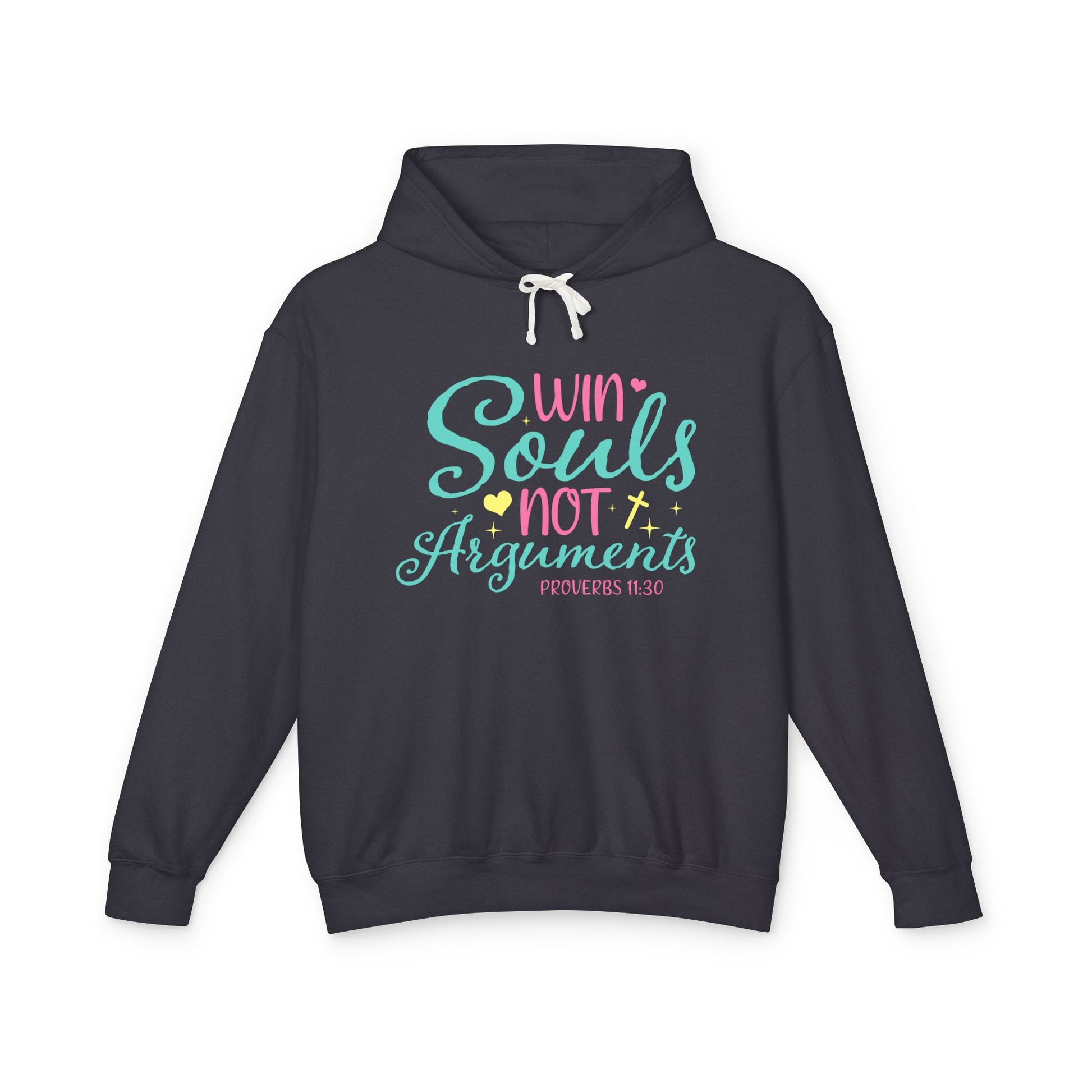 This Win Souls Not Arguments "Proverbs 11:30" Hoodie Sweatshirt offers a relaxed fit for a comfortable wear experience, perfect for those who value sustainable cotton farming and environmentally friendly dyeing practices. It gives off a positive, inspirational vibe, making it a great addition to any casual wardrobe. Ideal for adults looking for a stylish and meaningful hoodie to wear during gatherings, religious events, or daily activities.